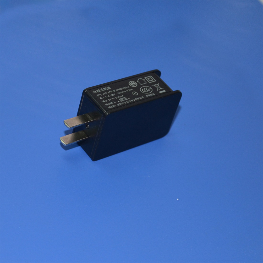 5V2A China pin USB power adapter,5V2A CN plug USB charger; Model: JHD-AP013C-050200BB-A, output 10 watts,high efficiency,low loss,built in EMC/EMI filter, Safety Approval: CCC,PSE,UL,FCC,CB,GS-TUV,CE. widely used in the electronic digital,communication.